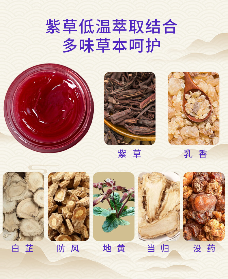 紫草、乳香、白芷、防风、地黄、当归、没药、山茶油、蜂蜡